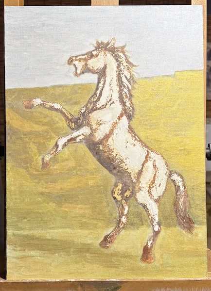 キャンバスボードにムスタングの下描きをしました。これも昔買って手付かずだったキャンバスボードです、予め裏に木材で枠を貼り付けてそのまま飾れるようにしてあります。絵って飾るのが前提ですよね?飾って見たいじゃないですか。うちなんか狭いのでせいぜい4号から10号止まり?と言うか飾れるような壁面がないといけません。さらに重い額を吊るす釘を打てるか打てないかなど色々問題が出てきます。大きな絵はどうするんですかねぇ、床に直に置いてみるとか、、、。鉛筆で描いた後ローシェンナーを薄めて下描きを押さえて簡単な陰影を付けて調子を見ます。この時点ではバックの山々がいい感じで予想通りだったのですが、、、後々おかしな方向へ;汗。さらに今回普段やらない事を実験的にやって厄介な事に;汗。続く。