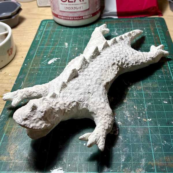 下地のクロストレイや追加の四肢や尾が乾いたので徐々に細部を作って行きます。手や足、顔の部分にもそれらしい部品を付けて行きます。背中に怪獣らしいスパイクを追加。スパイクも本来は石粉粘土で型作ればいいのですが、何しろ適当に作りますので;汗、クロストレイをペインティングナイフでペタッと盛り上げました。一列じゃ寂しいので3列に。顔にもスパイクを追加、目の部分の膨らみも追加。これでカエルみたいだった見た目が一気に怪獣らしくなりましたwwwそしてまた乾燥、、、。
