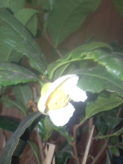ネットで買った(家の近くでは売っていない)お茶の木。ついに花が咲きました。玄関に避難してますが、外は霜柱と雪。来年新芽を見ることができるでしょうか。(^人^;)
