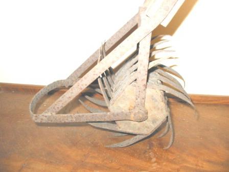 友が倉の中を掃除していました。 物陰から鑑定団行きがでてきたと叫びました。 水田の中耕除草機”太一車”でした。 当地倉吉の中井太一郎氏が発明したものです。明治25年です。 当時田の草取りに腰をかがめていて苦労しました。 稲の間を車を押していくと、羽が草をはねのけます。 とっても喜ばれたものでしょう。 稲扱き千羽も当地の花形製品でしたが、回転式がでると凋落しました。 回転式では米が砕けると最初は敬遠されたようです。 そこで回転式と千刃の長所を組み入れた稲精機なるものを当地の松田宇平氏が発明しました。 明治41年です。 刀製作が斜陽になると、鋼の技法で稲扱ぎ千刃に移行した進取の気鋭はいろいろの発明を生み、先人の輝かしい活躍があちこちにみうけられます。 幾度かの河川の氾濫も千人波止なる名をつけるほどの苦労をして堤防の設置で乗り切っています。 平野と川底が変わらない河川を手なずけた力は尊敬にあたります。 信玄堤、清正堤に劣らぬ力量を先人にみます。