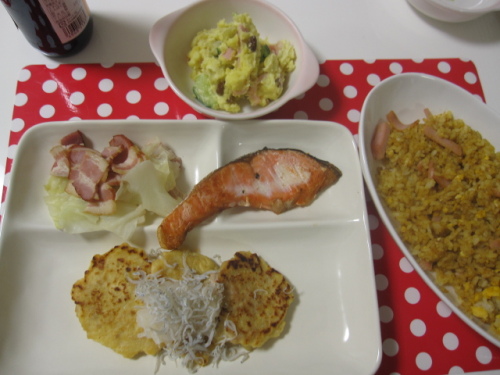 こんばんわ♪今日も献立の紹介です。豆腐ハンバーグおろしじゃこのせベーコンキャベツのスープ煮塩しゃけとさつま芋のポテサラ子供には、ドライカレー 以上です 今日はお天気も良くももは朝からずっと庭に出っぱなしで・・何してるかと思えばずっと昼寝したり、ゴロゴロです暑くなったのか、家に入ってもまた、寝るは寝る首痛くないのかい?変な寝方して・・・私だったら、首寝違えてしまいそう~起きたかと思えば、歯磨きの始まり・・・上手に出来てるね~気持ちいいのか顏がうっとりしてるように見えますそれでわこの辺で