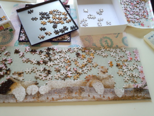 こんにちわ♪もう11月に入り早いですね一年の時の流れは・・・景色も随分秋めいて来ました(^_^)何年かぶりにパズルを買ってみました。家事の合間に少しづつやって1週間かかりました(^_^;)チョットめげそうになるくらい止まってしまうことも・・・形になってくるとまた、頑張りも出てきます。ほぉ~っとしてまた考えてしまいます。あと少し・・・出来上がりの楽しみが出てきました。完成!!!やっと出来上がりヽ(^。^)ノももとテツにも動くおもちゃを買ってやりました。もも・も興味深々!テツも同じく興味深々!しかし、テツはすぐにくわえて持っていこうとしてます。壊さないでよ~(~_~;)ももはビビりなので、テツの様子を遠目でうかがってます。ももは最後まで、おもちゃにはクンクンしか出来ませんでした(^_^;) それでわこの辺で(^_^)/~