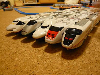 ゆうちゃんのプラレールコレクション。新幹線だけでも、ご覧のように6種類ある。紹介すると...奥から ・700系のぞみ ・E2系やまびこ(東北新幹線) ・400系つばさ(山形新幹線) ・E4系MAX(東北新幹線) ・イーストアイ(JR東日本) ・E3系こまち(秋田新幹線)という布陣。なぜか、ほとんどが JR東日本の車両で、700系を除いて、私も見たことがない列車ばかり。これは、本人が新幹線に乗ったことがないので、絵本で見る車両のほうに、馴染みがあるためか。確かに、JR東日本の新幹線の方がバリエーションも豊富で、絵本でも、多くのページを割いて紹介されている。---この中で「こまち」「やまびこ」「つばさ」は、連結器が出し入れできて、連結して走れる。最初、祖父母に 連結器付き「つばさ」をもらったのだが、連結器のスイッチ操作が大のお気に入りになった。ただ、1編成だけでは 連結して遊べないし、本人も「れんけつして あそびたい」と欲しがっていた。ただ、欲しいモノをすぐ買うのもどうかと思って、数ヶ月ほど、買い与えるタイミングを計っていた。そして、今回ついに、お誕生日のプレゼントに、こまち・やまびこの連結セットをあげた。案の定、大喜びして、ベッドの中でも抱えたままだ。最近のプラレールは、私が子供だった頃と比べ、ずいぶん、いろいろな機能が付加されている。このような連結機能のほかに、走行音を発したり、ドア開閉や、駅・踏切・橋などの情景部品なども。だんだん、模型のような方向に近づいてきている。---ゆうちゃんは、本当は大人の鉄道模型が欲しいらしい。NHKの趣味悠々の鉄道模型第2シリーズを見て、また、模型の世界が気になりだしたようだ。以前に放送していたときも、かなり楽しんでいて、そのことを日記に書いたら、三波豊和氏からコメントを頂戴した。でも、3歳になったばかりの幼児には まだ模型は早すぎるので、今はプラレールを模型だと思って、遊んでもらっている。