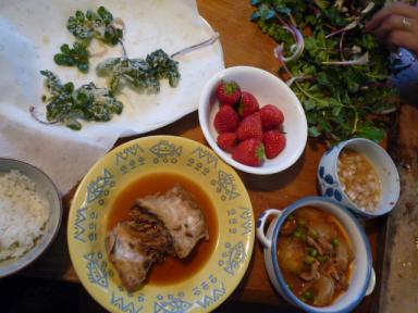 この所主人が毎日のように防風を取りに行って来ます。一時絶滅寸前になったために、今では取りに来る人がいないらしいのです。防風の白い茎だけを使った酢味噌和え。絶品です。(右端)防風の天ぷら。四国の真鯛の煮つけ。新野菜のトマトスープ(グリンピース、新じゃが、新玉ねぎ)近くの苺農園の苺。 何もかも伸びる季節、すべての物がおいしいですね。