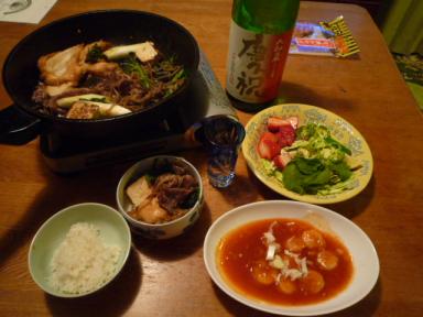 母のよく言う「貧の重ね食い」です。食べたい物をみんな作りました。まず何よりご飯がおいしかった!地元農家太田さんブランドの「太陽のお米」と発芽米のブレンド。炊き上がった時の匂いから違っていて、昔懐かしいご飯の味がしました。すき焼きに初めて、「喜界島のさとうきび租糖」使用。これは黒糖のくどさがなく、程よく塩味がして、コーヒーに使っていたのですが、すき焼きにすると驚くほど甘みが爽やかで、白糖独特のべたつきがありません。麩も、沖縄の麩を使ってみました。ダイナミックな大きさの麩はグルテンが多そうで、すき焼きをさらにヘルシーにしてくれました。ネットで買った台湾料理の店「台北」さんのエビチリ。ちょっと甘かったかな?でも中国味よりスパイシーです。野菜サラダ。今回は国産レモン、リンゴ酢、オリーブオイル、マスタードでシンプルにー。忘れてましたが、お酒は頂き物の金箔入り薩摩蔵「慶祝」。あっさりしながら、まろみがあり、最高です。これを女の小正月というのかな?