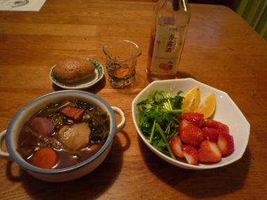 年末年始を乗り越え、やっと落ち着いて料理が出来ました。ベーコンと根菜のスープと、セリと苺のサラダです。食前酒は、中国のお酒、杏露酒(シンルーチュ)。 スープは、カブ、赤カブ、ニンジン、パセリ、長ネギ、玉ねぎ、ジャガイモ、ベーコン。白ワイン、赤ワインに加えて、プーアール茶を加えてみたために、色が悪くなっていますが、プーアール茶のスパイシーさはなかなかいいです。玉ねぎスープの素と、フルーツトマトのスープの素を、安売りした時に買ったのを足してみましたが、どちらもうまみ成分とか、甘み成分が加えられてるために、ちょっと嫌な味がしてしまいました。残念です。今度は生のトマトを加えて、再挑戦してみたいです。 サラダには、今が旬の国産レモンを使ってみました。酸味が柔らかくて、いいです。ドレッシングは、ゆずポン酢、レストラン自家製のドレッシング、ワインビネガーを合わせてみました。でもこういうシンプルなサラダには、レモンだけの方がよかったかもね(汗)。