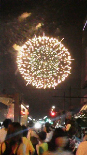 もう8月! 今日は富山の花火大会。 仕事が終わって散歩がてら西町のあたりまで見に行きました。 たくさんの人で、座るところもありません。歩行者天国になってましたが。 仕方ない。立って見るのも疲れたので、みかさん、初めてのスタバで、飲み物買って一休み。 再び、飲み飲み帰りました。 花火は、もちろん綺麗でしたよ!!