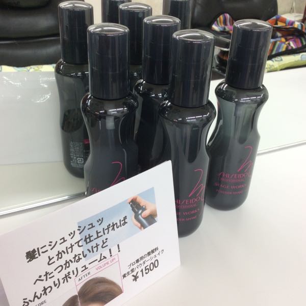 この整髪料の事まだお知らせしていませんでした。 セットする時に カラカラとよく振ってから 髪にシュシュッとかけて仕上げると ベタつかないのにふんわりボリュームが出ます。 細かいパウダーが髪の周りに付いて、セットが長持ちするのです。 ベタつかないので、手ぐしで何度も整え直しも出来ます! 髪が、細くなってボリュームが出にくくなってきた‼︎と、いう方 プロ仕様の整髪料なので、「ヘアーサロンてらしま」でお買い上げ下さい! ¥1500デス 資生堂