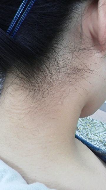 いつも来ていただいている高校生の女の子。 赤ちゃんの時からのお馴染みさんです。 襟足の写真撮っても良いよ♪と、言ってくれたのでアップします。 もともと色白ですが、無駄な毛を剃ると やっぱり綺麗になりますね♪ 写真の加減で、首筋が赤い様な感じになってますが、肌は、普通に白いです。
