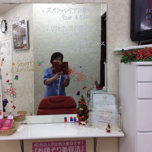 2、3日前から寒くなってきました‼︎ 今日は、久しぶりに日差しが戻って来た様です。 皆さん、今だ!と、タイヤ交換しているのかしら・・・ 穏やかな日曜日となっています。 「お顔そりエステ」のコーナーもクリスマスバージョンに変えてみました。 毎月ご来店いただいているお客様の中には 楽しみにされている方もいらっしゃいます。 今回、私も写ってみました。
