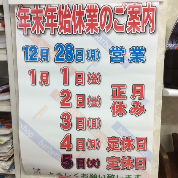 昨日は、インフルエンザの予防接種を受けてきました。 かかりつけのお医者さんは、予防接種を受ける方ばかりでした。 お年寄りから、若い方まで皆さん気をつけているのですね。 昔は、注射した後モミモミしてましたが、今では、「揉まなくて良いですよ〜」と、言われます。 後は、何となくむず痒いデス。 11月も半ばになってきました。 風邪ひかない様気をつけマス! 年末年始のお休みですが、12月21日が年末最後のお休みで、それ以降はずっと31日まで通常通り営業しています。 年始は、1月1日から5日までお休みいたします。 今までにない最長の休みとなります。 でも、どうしても急な用事が入ってしまった‼︎と、いう方はお電話してみてください。家にいましたら何とかしましょう! 成人式のお顔そりは、1月に入る前のご予約がオススメです! 年末年始は、お早めにご来店、ご予約お願いいたします。