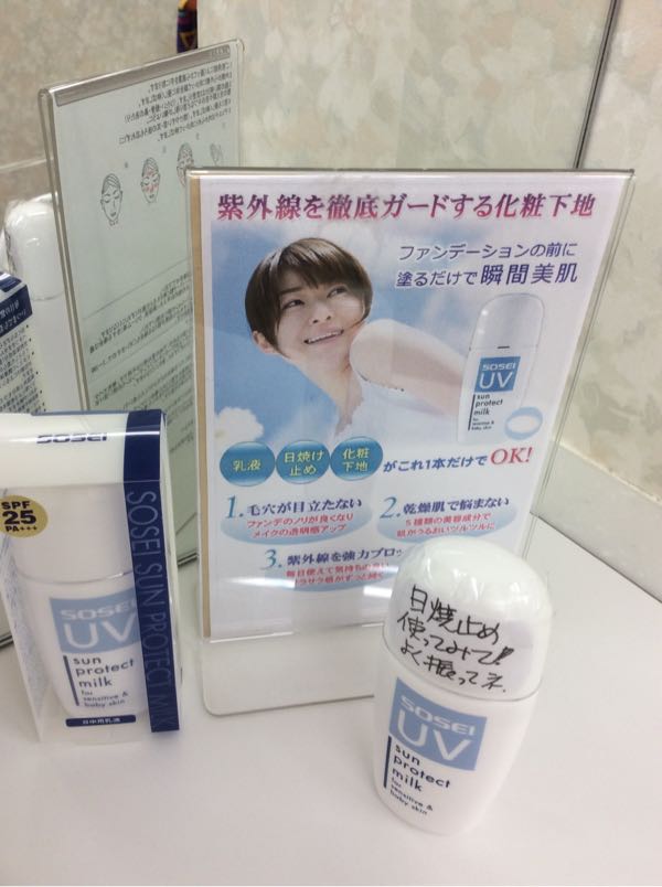 お店で扱っている「日焼け止め」の紹介です! 春になって陽射しが強くなって来ました。 日焼けは、夏だけでなく 今頃もバンバンしちゃいます。 洗濯物を干している時、花に水をあげている時、チョットそこまでのお出かけの際も気をつけたいものです! こちらの日焼け止めは、 SPF-25、PA-+++ です。 そもそもSPFとは、紫外線B波に関係してて、シミ、そばかす、皮膚ガンのもと。 何も付けていない皮膚に比べて何倍遅く日焼けが始まるか? 25ということは、25倍遅くなるよってこと。 PAは、紫外線Aの方で、黒くなるだけでなく、シワ、たるみに関係してるみたいです。 その他、紫外線吸収剤や散乱剤は、肌荒れや乾燥を起こすらしいです。 だから、普段使いとしてオススメするのがこちらの商品! SPFは25、PAは+++、吸収剤などは入ってません。 なので、化粧下地として使えます。美容成分も含まれているので、お肌ツルツル。紫外線を強力ブロック、毎日使えて気持ちの良いサラサラ感です。 子供用としても使えるし、石鹸で簡単に落ちますよ。 試供品を置いてますので、お顔そりエステの後にお試しを!