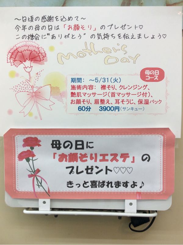 来月8日は、母の日です。 「ヘアーサロンてらしま」のお顔そりエステに「母の日コース」を作りました。 期間は、5月いっぱいです。 お母様へのプレゼントや普段頑張る女性のご褒美です。 顔そりやえりそりの他 お顔のマッサージに首までのマッサージ、保湿パックが付きます。 ぜひ、ご利用ください。 早めのご予約お待ちしております。