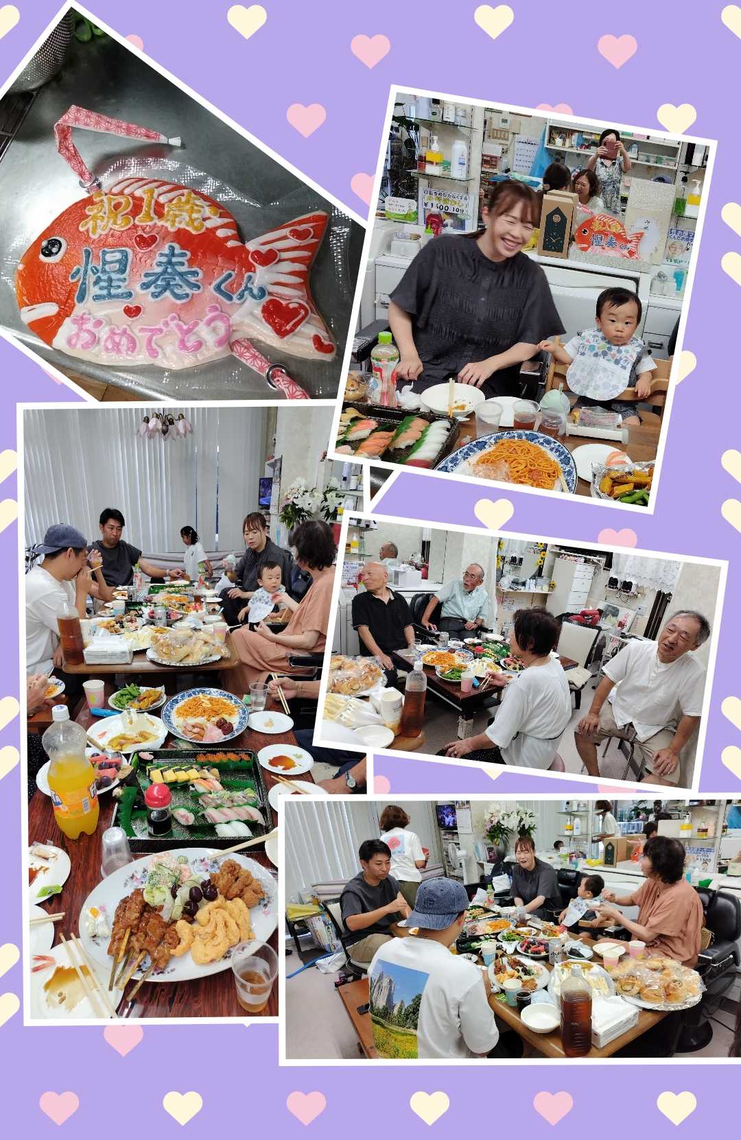 ヘアーサロンてらしまホームページhttps://sites.google.com/view/toyamaterasima/homeこんにちは!お顔そりエステ♪てらしまみかです。お休み2日目。お昼から、小さい子3号の1歳のお誕生会をする事に、なっていたので朝から、スーパーヘ行っていろいろ、お惣菜を買って来ました!長男が、お寿司やケーキを用意するので、オードブルやパスタ、パンや果物、お菓子に飲み物...。あれやこれやとテーブルいっぱいになりましたよ。1歳の子は、全然食べないのにね〜。一升餅の代わりに、鯛のカマボコを用意して、担がせました!お店にテーブルと椅子を並べて、3時間程、ワイワイ、がやがや。お盆も合わせて、久しぶりにみんなで集まって楽しかったですよ~。新しい生活様式で。皆様のご来店お待ちしております。ヘアーサロンてらしま076-424-0655富山県富山市石倉町2-22