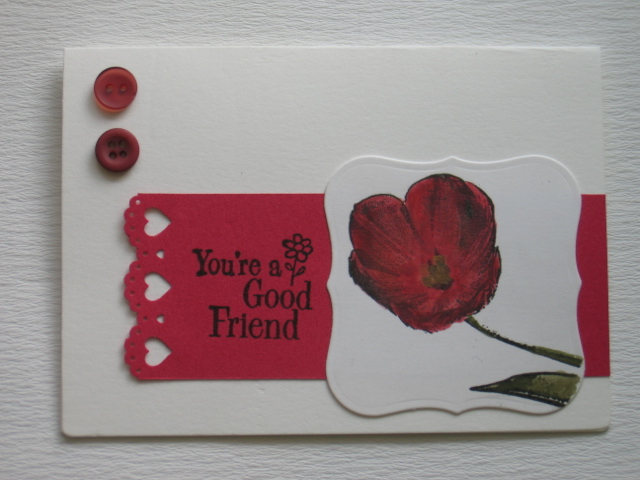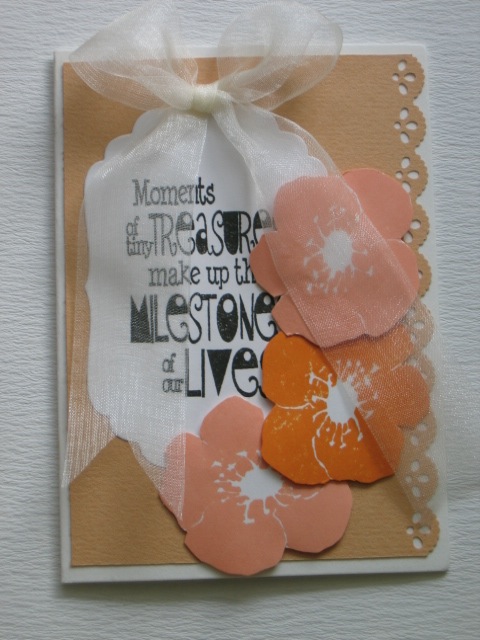 今日のカードはポピーのカードです。こちらのカードも私の大好きなブログ、まきJOさんのブログの2010年2月23日掲載の作品を真似て作りました。とても勉強になります。使用ペーパー:B6カード、普通紙、ミ・タント紙使用スタンプ:Art impressions使用インク:MEMENTO、DistressInkその他:オーガンジーリボン
