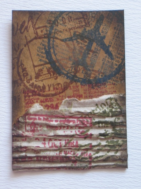 今日のカードはmixiの中の『スタンプでATC!』というコミュのATC Challenge ♯54「乗り物にまつわるATC」 です。今回の出題者はなんと私こと てらとん です。このたび諸事情で4月後半の出題の依頼を受け、お題を担当させていただくことになりました。さて、今回のテーマは「乗り物にまつわるATC」です。4月末からいよいよゴールデンウィークも始まり、旅行やお出かけで乗り物に乗る機会も多くなるのではないかと思います。そこで乗り物にまつわるATCをお題にいたしました。ルール:乗り物にまつわるものであればなんでもOK!飛行機、船、車、電車、バイク、自転車、三輪車、乳母車、馬車、ブランコ 、気球、などなど、、、上記に限らず、乗り物にまつわるものを作品に使っていただければOKです。乗り物がスタンプでなくてももちろんOKですが、どこかにスタンプは使って下さいね。サンプルは簡単なものを3点作りました。画像1 背景はクラフトシートにDistressInkをDTPしてDTPしたインクに水を スプレーして普通紙をDTPして着色しました。 いくつかスタンプをDistressInkで色を変えて捺し、 段ボールを破って貼りスタンプをDistressInkで捺しました。画像2 白抜きテクニックのバティック(ろうけつ染め)をしてみました。 バイクをクリアエンボスして背景を画像1と同じように着色し、 バイク部分をMENENTOの黒で着色し、アイロンでエンボス部分を溶かし 白抜きをしました。画像3 パターンペーパーにCiao*CarinaさんのOBPのスタンプを切り貼りしました。 そして100均で購入したリボンを貼り、マスキングテープの柄(三角、四角) を切り取り貼りました。