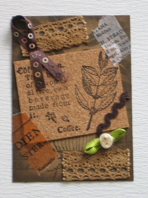 今日のカードはmixiの中の『スタンプでATC!』というコミュのATC Challenge ♯42「 異素材に押してみよう~」 です。今回は紙以外の物に押してみよ~という簡単チャレンジです!皆さん既にメタル、布、革やいろんな素材にスタンプされてますね!インクによってもできたりできなかったり、ある意味実験ですね!というお題です。私は100均で購入したコルクシートにステイズオンで捺しました。コーヒーをテーマに作ったのですが、使用したレースもコーヒーで染めています。今まで過去のチャレンジをしていなかったお題をチャレンジしてきましたが今回のチャレンジで全て過去のチャレンジも終わりです。使用ペーパー:クラフト紙、コルクシート使用スタンプ:Stampington & Company使用インク:StazOn、DistressInkその他:レース、リボン、リックラック、マスキングテープ