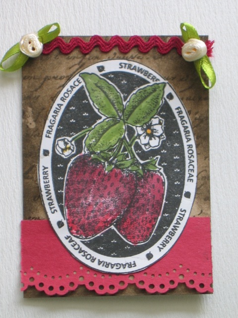 今日のカードはStampington & CompanyのStrawberryのATCです。ここのところ夕食後にイチゴを戴くことが多くなりました。私はコンデンスミルクをかけて食べるのが好きなのですが、そのまま食べられる方がほとんどなのでしょうか?使用ペーパー:クラフト紙、色画用紙(100均)、普通紙使用スタンプ:Stampington & Company、HeroArts使用インク:DistressInk、MEMENTO Dual Markerその他:リックラック、バラ飾り