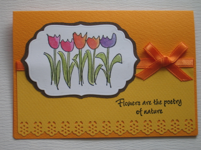 今日のカードもチューリップのカードです。チューリップは大好きな花です。駅に行くまでに毎年チューリップを咲かせている家があるのですが、その家のチューリップも蕾がだいぶん大きく膨らんできました。こちらのカードも私の大好きなブログ、まきJOさんのブログの2010年2月23日掲載の作品を真似て作りました。使用ペーパー:A5カード、普通紙、ミ・タント紙使用スタンプ:HeroArts使用インク:Versafine、MEMENTO Dual Markerその他:サテンリボン