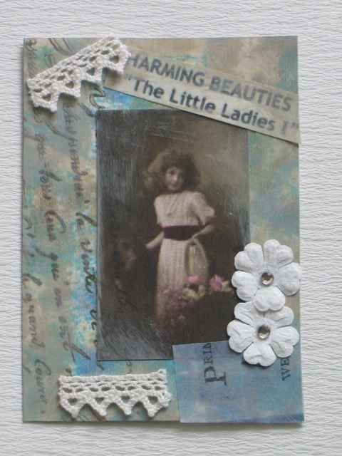 今日のカードはCiao*Carinaさんで購入したTwistted PapersのVintage Women Collage Sheets vol.1 CDの中の写真を使ったATCです。使用ペーパー:普通紙、Twistted Papers使用スタンプ:HeroArts使用インク:DistressInk、Acrylic paint Dabber、Adirondack Alcohol Inkその他:レース、ラインストーン、プリマ、マスキングテープ