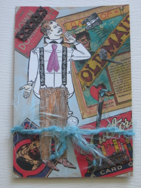 今日のカードはCiao*Carinaさんで購入した、Character Construction/French Laundryシリーズno.12のシートのスタンプを使ったカードです。使用ペーパー:モダンクラフト紙、普通紙、Distressables Papers CD使用スタンプ:Character Construction使用インク:Versafine、Acrylic paint Dabber、水彩色鉛筆その他:毛糸、レース