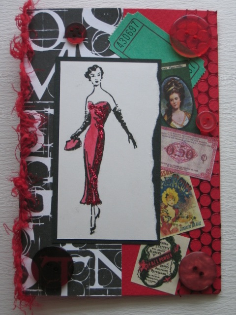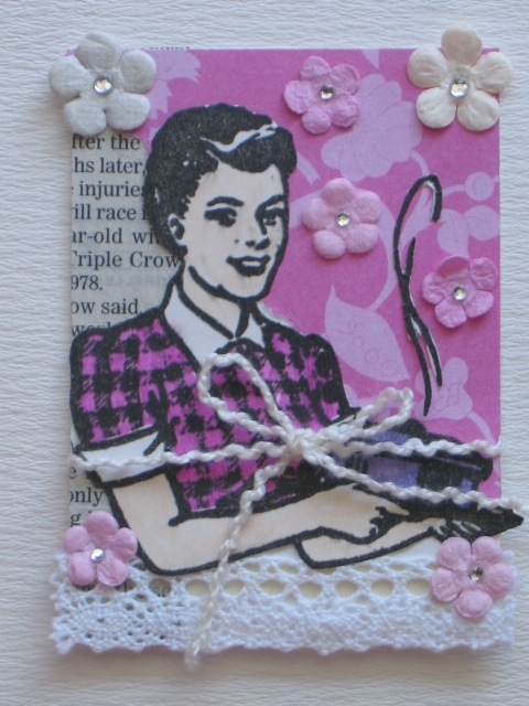 今日のカードはViva Las Vegastamps!のFifties Lady With Cookingのスタンプを使ったATCです。使用ペーパー:パターンペーパー、英字新聞、普通紙使用スタンプ:Viva Las Vegastamps!使用インク:Versafine、コピックペンその他:プリマ、ラインストーン(100均)、毛糸(100均)、レース(100均)