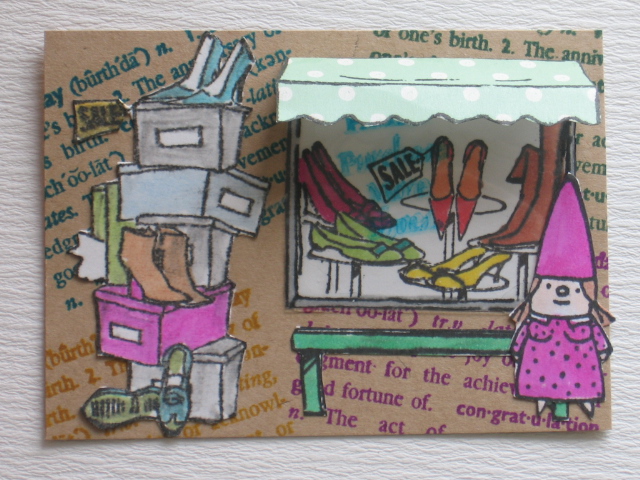 今日のカードはmixiの中の『スタンプでATC!』というコミュのATC Challenge ♯58「ショッピング! 」 です。ルールは ●ショッピングにまつわるATC ●緑色を使う。 ●スタンプをどこかに使う。 です。 というお題です。そろそろバーゲンも始まってきていますよね。私はArt ImpressionsのShoppe WindowsシリーズのShoe Shoppeのスタンプのセットを使って作りました。窓の日よけ部分は別にスタンプして立体的にしました。使用ペーパー:普通紙、モダンクラフト紙、トランスパレンシー、パターンペーパー使用スタンプ:Art Impressions、OBP、Hero Arts使用インク:Versafine、StazOn、コピックペン、Adirondack