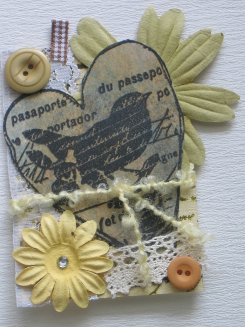 今日のカードはStampington & Companyのobin Script Heartのスタンプを使ったATCです。使用ペーパー:コットンエンボス紙、普通紙使用スタンプ:Stampington & Company使用インク:DistressInkその他:プリマ、ラインストーン(100均)、ボタン、毛糸、レース、リボン