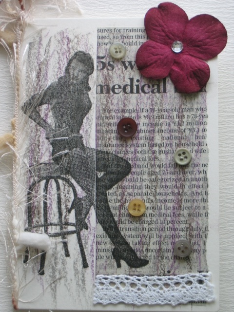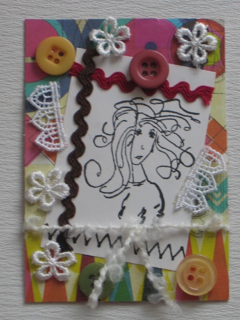 今日のカードはStampington & CompanyのThe Unruly Girls Clubのスタンプを使ったATCです。こちらのデザインはStampingtonの雑誌のInspirations2008/2009を参考に作製しました。使用ペーパー:パターンペーパー、普通紙使用スタンプ:Stampington & Company、Leave Memories Acryli Stamps使用インク;Versafineその他:リックラック、レース、ボタン、毛糸