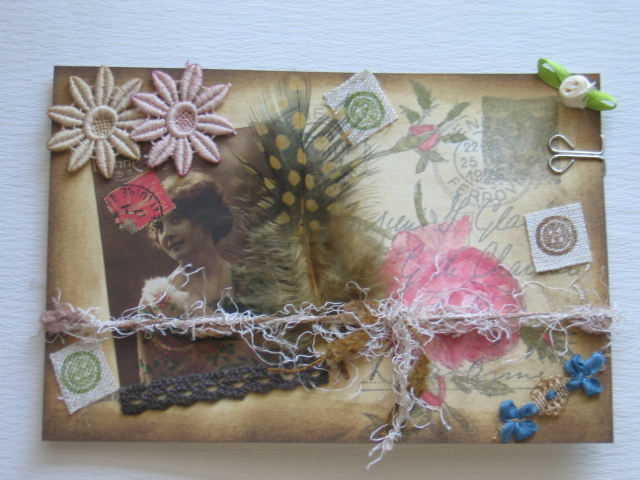今日のカードはHand to Handさんで購入したStamps HappenのRose Postcardのスタンプを使ったカードです。いろいろ使ってコラージュしました。使用ペーパー:Clip Art CD(Stampington & Company)、普通紙使用スタンプ:Stamps Happen使用インク:DistressInk、Maicacolor、versacraftその他:レース、毛糸、羽、麻テープ