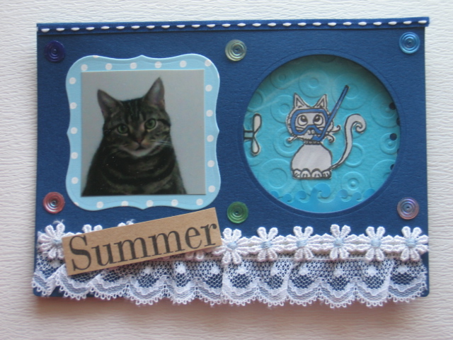 今日のカードもニャンコdeSUMMERのカードです。昨日、ニャンコdeSUMMERの交換会の作品を掲載いたしましたが、交換会を参加するにあたり、最初に作製したのが実はこちらのカードでした。交換会の参加を決めた時、最初にイメージしたのがJJ's OBPの水中めがねのプリシラちゃんをメイン使って海(水中)を表現したいと考えました。またサブテーマでもある『写真を使ってみよう!』ということでしたので空いたスペースに写真のニャンコを貼り、出来上がったのがこちらの作品です。いろいろ考えたのですが、イメージ通りにならず、もんもんとしていましたが他に作品イメージも浮かばなかったので、こちらを交換会に出そうと準備を始めましたがやっぱりしっくりいかず、まだ締め切り日に時間もあったのでしばらく放置していました。写真もどううまくつかったらいいのか?浮かびませんでした。その後、主催者からのヒントでやはりニャンコの写真をメインに作ろうと考え昨日掲載した作品を作ることができました。こちらも作製準備をしてしまっていましたのでもったいないので準備した枚数分作製しました。せっかくなので義姉やスタンプのお友達に送ることにしました。使用ペーパー:カードストック、マーメイド紙、普通紙、パターンペーパー モダンクラフト紙、トランスパレンシー使用スタンプ:JJ's OBP使用インク:WaterColor、enbossing powder、MEMENTO、コピックペン StazOn METALLICその他:レース、リボン、スパンコール、波シール、Assorted Sequins