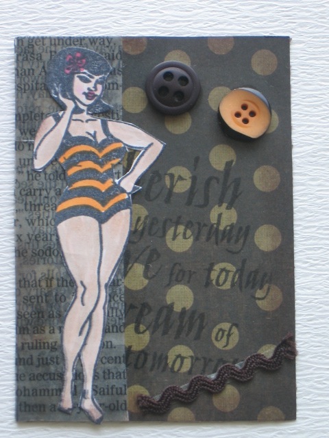 今日のカードはCiao*Carinaさんで購入したSideshow StampsのPin Up GirlのATCです。使用ペーパー:パターンペーパー、普通紙、英字新聞使用スタンプ:Sideshow Stamps、DarkroomDoor使用インク;MEMENTO、コピックペン、BeesWaxその他:ボタン、リックラック