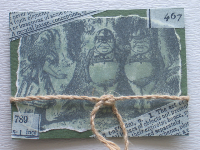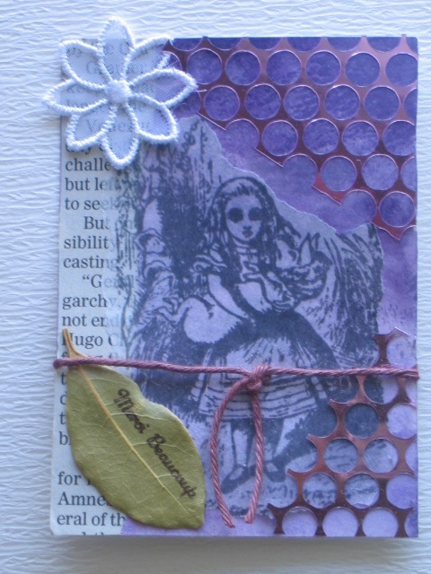今日のカードはAliceのスタンプを使ったATCです。使用ペーパー:普通紙、トレーシングペーパー、英字新聞使用スタンプ:Nature’s Blessings 他使用インク:Versafine、DistressInk、StazOnその他:レース、Punchinella、ローリエ、紐