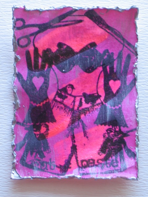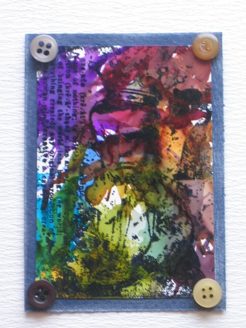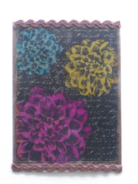 今日のカードはDarkroomDoorのViva la Flora vol.2のスタンプを使ったATCです。トランスパレンシーに黒のStazOnで捺し、裏からStazOnのピンク、ブルー、黄色を着色しました。使用ペーパー:ミ・タント紙、トランスパレンシー使用スタンプ:Darkroom Door使用インク:StazOnその他:リックラック