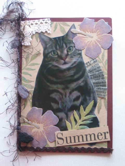 今日のカードはmixiの中の『★ニャンコSB★』というコミュの★ニャンコdeSUMMER カード交換会★に参加いたしましたカードです。我が家にはニャンコがいませんが、ニャンコ好きならOKということでコミュの仲間にいれていただきました。夏をイメージしたカードを作る。ニャンコモチーフをお忘れなく! サブテーマとして【写真を使ってみよう!】という課題です。(もちろんなくてもOK!) 我が家にはニャンコがいませんが、兄の家にアメショが2匹います。そのうちの”ちゃーぼー”(♂)を使ってカードを作成しました。背景のハイビスカスは昔、こどものかおのスタンプアドバイザーの方から戴いた暑中見舞いのカードを参考にアレンジして作りました。英字新聞はBeeswaxで蝋ひきしています。カードの中はミ・タント紙をエンボスホルダーでエンボスし、OBPのプリシラちゃんを貼りました。3枚のカード(同じもの、デザイン違いのもの何でもOK!)でしたが、私は主催者のMOONさんの分を含めて4枚作成いたしました。みなさんのところには中が何色のカードが届いたでしょうか?使用ペーパー:カードストック、モダンクラフト紙、英字新聞、写真用ペーパー ミ・タント紙使用スタンプ:こどものかお、HeroArts、JJ'S OBP使用インク:Metallic Metallic(こどものかお)、Encore、MEMENTO enbossing powder、Beeswax、コピックペンその他:レース(100均)、毛糸(100均)私がいただきましたカードはこちらです。上段:kayaさん、rina53さん下段:MOONさん+MOONさんよりThanksメッセージATCも戴きました我が家にニャンコが増えて癒されている毎日です。