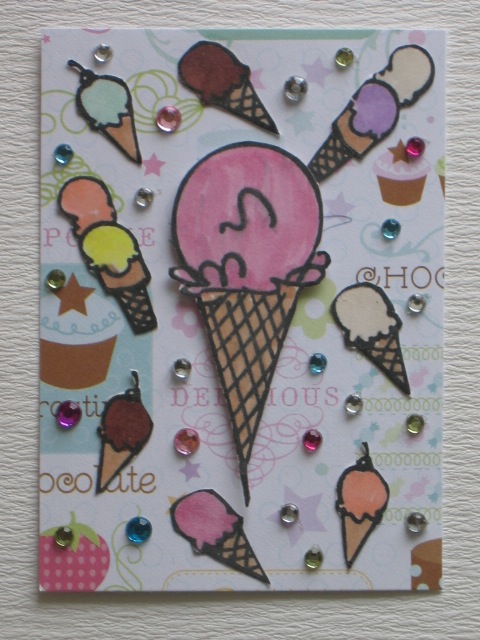今日のカードはHero ArtsのGelato Surpriseのスタンプを使ったATCです。毎日暑い日が続きますね。毎日冷たい物ばかり欲しくなります。使用ペーパー:普通紙、パターンペーパー使用スタンプ:Hero Arts、 OBP使用インク:MEMENTO、コピックペンその他:ラインストーン