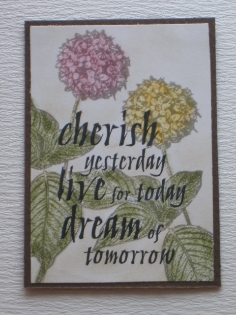 今日のカードはAliceのスタンプを使ったATCです。使用ペーパー:普通紙、ミ・タント紙使用スタンプ:Nature’s Blessings使用インク:Versafine、DistressInk、Spiritzその他:紐、Tim マスキングテープ