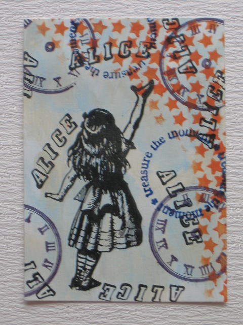 今日のカードはアリスのATCです。こちらのATCはStampington & Company社のSomerset StudioのMarch/April 2010を参考に作りました。使用ペーパー:普通紙使用スタンプ:Viva Las Vegastamps!、Hero Arts、Hampton Art使用インク:Versafine、Acrylic paint Dabber