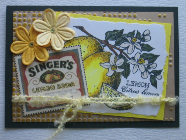 今日のカードはmixiの中の『Graphic45 Lovers!! 』というコミュのGraphic45 Challenge#7【yellow】です。今回もスケッチではなく、形状はなんでもOKで、カラー指定のみです。テーマ:『yellow』 主催者から黄色ってなかなか使わない色なんです。嫌いじゃ無いし、避けてるわけじゃ無いんですがなぜかあまり手に取らない色。 ということで『yellow』を選ばれました。確かに私も意識していない色でした。思い返せばほとんど使っていない???別に嫌いでなければ、避けているわけでもないのですが。黄色がテーマということで、レモンのスタンプとDomestic GoddessのFarmers Marketのペーパのレモンソーダを使ってポストカードサイズで作製しました。使用ペーパー:普通紙、パターンペーパー(Graphic45)、NTラシャ、 マーメイド紙、モダンクラフト紙使用スタンプ:PSX使用インク:MEMENTO、コピックペン、DistressInkその他:プリマ、毛糸、ラインストーン