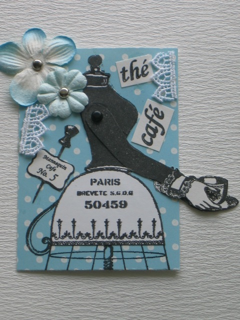 今日のカードはCiao*Carinaさんで購入した、Character Construction/Mannequin Cafeシリーズ No.5のシートのスタンプを使ったカードです。使用ペーパー:普通紙、パターンペーパー使用スタンプ:Character Construction使用インク:Versafineその他:レース、プリマ、ブラッド