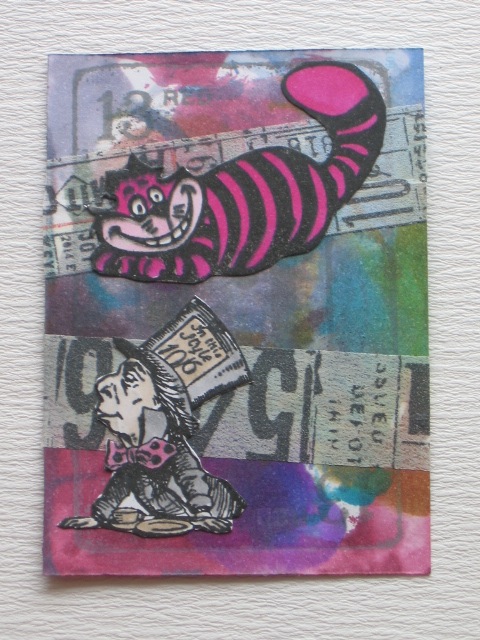 今日のカードはMad Hatter & Cheshire Cat のATCです。アルコールインクを紙に落として着色しようとしたのですが、紙を間違えて普通紙にしたため、インクが吸収されてしまいましたがもったいなかったのでマッドハッターとチシャネコを貼って作品に仕上げました。使用ペーパー:普通紙使用スタンプ:Viva Las Vegastamps!、Stampsmith使用インク:Adirondack Alcohol Ink、MEMENTO、コピックペンその他:マスキングテープ