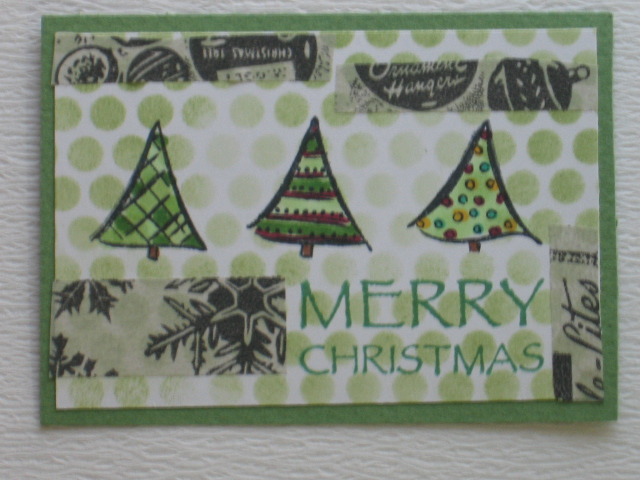 今日のカードはmixiの中の『スタンプでATC!』というコミュのATC Challenge ♯70「おそうじATC 」 です。今回のテーマ:おそうじATCいろいろと考えずに~とにかく散らかった?今作業するスペースにあるもので作りましょう。 何か作った時に多めに出来ちゃったパーツ、スタンプしたけど~使わなかったもの。 作ってみたら合わなかったパーツ。色を塗ったらイメージが違っちゃったパーツなどなど。 すぐに捨てなかったものや、半端なもの、切り刻んだ残りなどをお掃除も兼ねて使いましょう。 ルールはとっても簡単。 自分の作業スペースのお掃除をしながら・・・ちょこっと中断して気軽に作ろう! あれこれお道具を出さずに、本当にお掃除メインで簡単に。 スタンプは必ず使って下さいね。 というお題です。私はクリスマスのスタンプで使っていなかったスタンプを使おうと捺したもののイマイチだったのでそのまま放置していたのですが、今回のお題を機会に作ってみました。クリスマスツリーのスタンプを捺して色を塗ってまま放置した状態を、Punchinellaを使って丸をステンシルし、文字を捺してTimのクリスマスのマステを貼っただけのATCですが、捨てるはずだったものがとりあえず作品になりました。使用ペーパー:ミ・タント紙、普通紙使用スタンプ:HeroArts、DarkroomDoor使用インク:MEMENTO、コピックペン