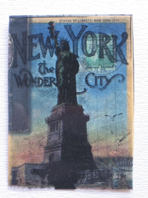 今日のカードはStampSmithのスタンプとTim Holtz Digi-Distressables Papers &Framesを使ったNEW YORKのATCです。Stampsmithのスタンプと印刷した自由の女神が全く同じ大きさと角度だったので、OHPシートにステイズオンで捺し、ペーパーに貼り付けました。使用ペーパー:OHPシート、Tim Holtz Digi-Distressables Papers &Frames使用スタンプ;Stampsmith使用インク:StazOn