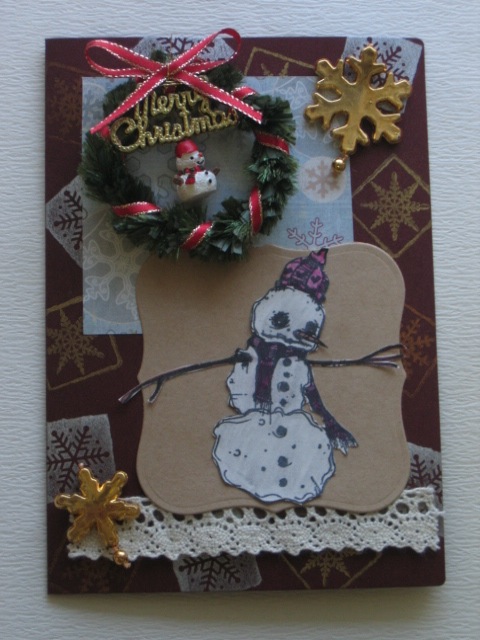 今日のカードはCiao*Carinaさんで購入した、Stampotique Originals/Snowmanのスタンプを使ったカードです。使用ペーパー:カードストック、モダンクラフト紙、パターンペーパー使用スタンプ:Stampotique Originals、HeroArts使用インク:MEMENTO、コピックペン、BRILLIANCEその他:レース(100均)、クリスマスリース、雪の結晶の飾り(100均)