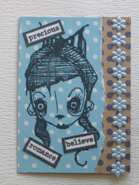 今日のカードはCiao*Carinaさんで購入した、Stampotique Originals/Miss Snottieのスタンプを使ったATCです。使用ペーパー:モダンクラフト紙、パターンペーパー、パターンペーパー使用スタンプ:Stampotique Originals、DarkroomDoor使用インク:MEMENTOその他:リボン