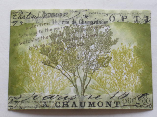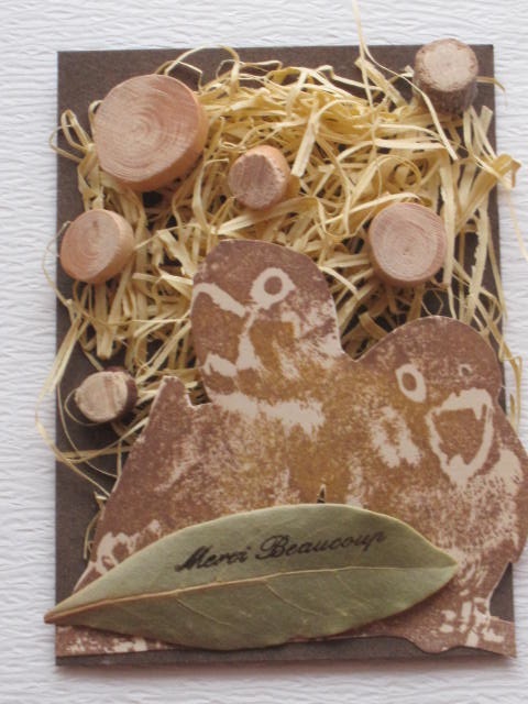 今日のカードはmixiの中の『スタンプでATC!』というコミュのATC Challenge ♯99「背景を作ろう」 です。 出題者より--------------------------------------------今月のお題は「背景を作ろう」です。 既成のスタンプ以外のもので背景を作ってみましょう。 私はプチプチにアクリルを塗って押しましたが、 丸いフタやフォークの先、スポンジ、などなど、いろんなものにインクをつけて押してみたり。 ペーパーや新聞、広告などを切り出して貼ってみたり。 背景が出来上がったあとは、スタンプをどこかで使ってください。 背景に直接押しても、私のように切り出しても。 ------------------------------------------------------私は梱包で使うペーパーパッキン?を茶色の紙に貼って背景を作ってみました。後は鳥さんを別の紙にスタンプして切り貼りし、月桂樹、切り株を貼っただけの作品です。いつもスタンプかインクで背景を作っていましたのでとても新鮮な気持ちでした。使用ペーパー:普通紙、ミ・タント紙使用スタンプ:DarkroomDoor、 他使用インク:Versafine、StazOnその他:ペーパーパッキン、月桂樹、切り株