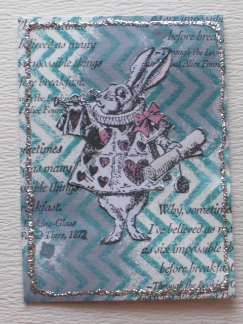 今日のカードはAlice(Rabbit)のATCです。使用ペーパー:普通紙使用スタンプ:TJ designs、DarkroomDoor使用インク:DistressInk、walnut Ink、Stickles