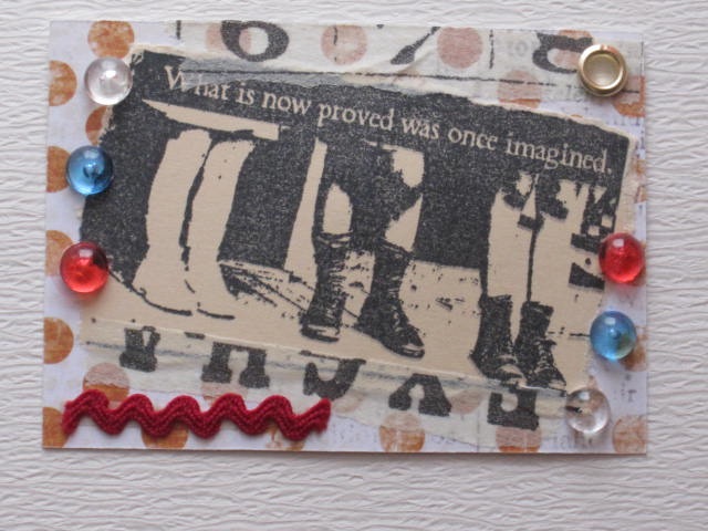 今日のカードはPaperbag StudiosのImaginedのスタンプを使ったATCです。使用ペーパー:普通紙、パターンペーパー使用スタンプ:Paperbag Studios使用インク:Versafineその他:マスキングテープ、はとめ、リックラック、Dew Drops