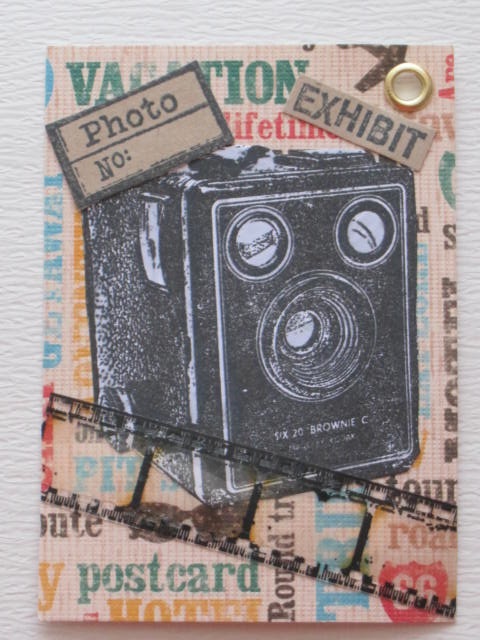 今日のカードはCiao*Carinaさんで購入したDarkroomDoorのPhotographyのスタンプを使ったATCです。使用ペーパー:普通紙、モダンクラフト紙、パターンペーパー使用スタンプ:DarkroomDoor使用インク;Versafineその他:はとめ、Film Strip Ribbon