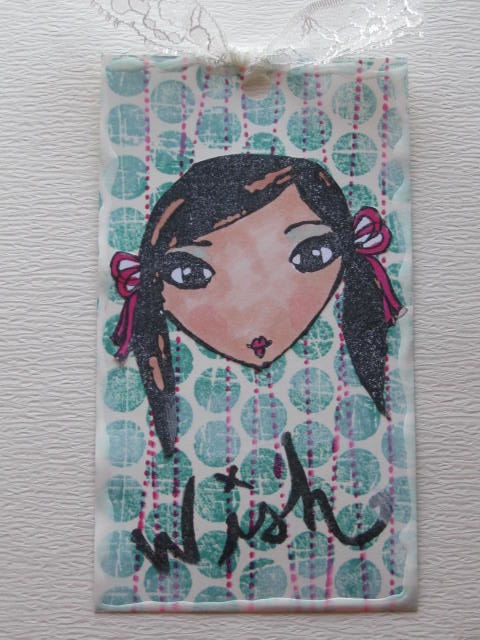 今日のカードはPaperbag StudiosのPigtailsのスタンプを使ったタグです。使用ペーパー:普通紙使用スタンプ:Paperbag Studios、DarkroomDoor、Stampotique Originals使用インク:MEMENTO、コピックペン、アクリル絵具その他:レース